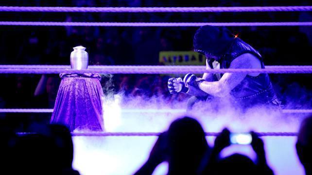 The Undertaker entered the arena, to pay a tribute to Paul Bearer, who managed The Undertaker's career and really made The Undertaker to who he was today. The urn, symbolic, was in the middle of the ring, and as Undertaker stood before it, it was a fitting tribute. But then, there was to be the ultimate mark of disrespect, as The Undertaker was interrupted by...